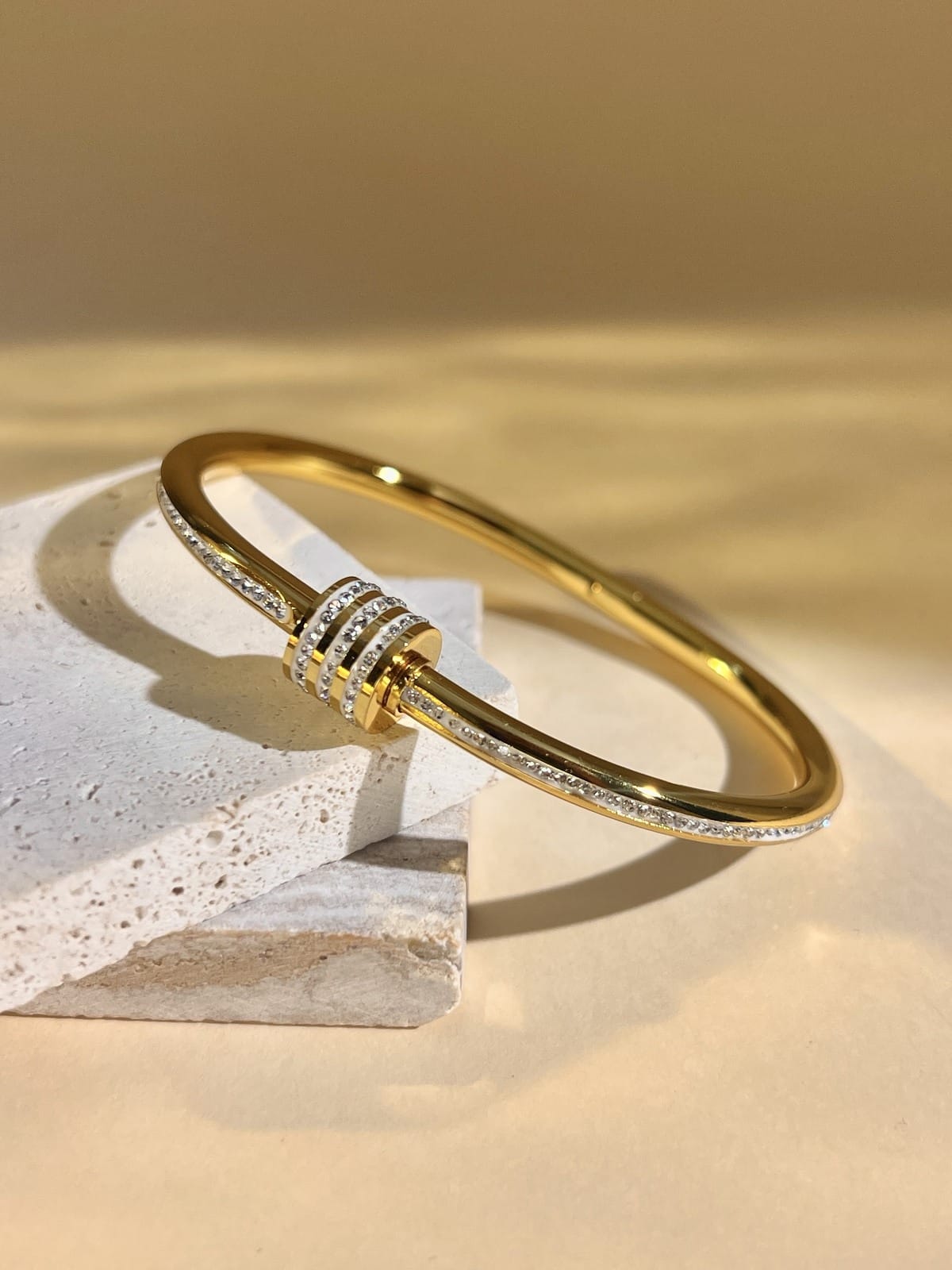 Crafted from durable stainless steel and coated in luxurious gold plating, this bangle exudes elegance with its intricate design and sparkling rhinestones. With its water and wear-resistant properties, it's a reliable accessory for any occasion, adding a touch of luxury without being too flashy.